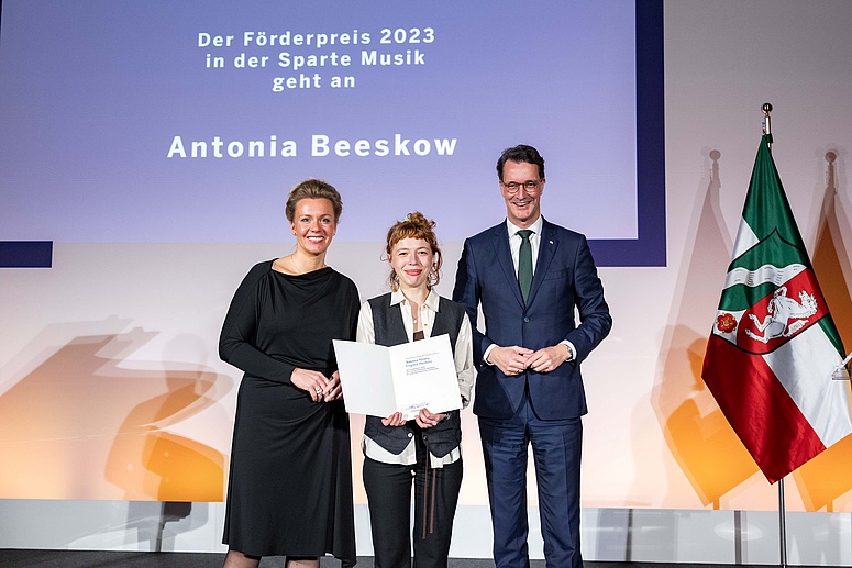 Neben dem mit 25.000 Euro dotierten Kunstpreis, der in diesem Jahr an Helge Schneider ging, hat die Landesregierung in den Sparten Baukunst, Literatur, Musik, Darstellende Künste und Visuelle Künste einen Förderpreis vergeben. Er ist jeweils mit 15.000 Euro dotiert und ging in der Sparte Musik an die Klangkünstlerin Antonia Alessia Virginia Beeskow. Beeskow studierte am Institut für Musik und Medien den Masterstudiengang Klang und Realität.