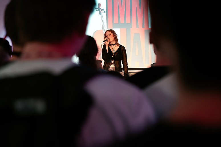 Die Abendsonne steht tief zwischen Gebäude 3 der Hochschule Düsseldorf und der Mensa. Mit ihren letzten Strahlen heizt sie die Konzertfans auf, die in Trauben vor dem Café Freiraum beieinander stehen. Wo der Eingang ist, erkennt man auf den zweiten Blick. Die Studierenden plaudern, Getränke in der Hand, Manche haben Instrumentenkoffer dabei. Im vorderen Bereich des Cafés Freiraum wandern die Getränke über die Theke, hier herrscht Kommen und Gehen. Mittendrin: Nora Bögel. Sie studiert Jazz- und Popklavier am IMM und gehört bei dieser Session zum Organisationsteam, genauso wie die Sängerinnen Anna Hummen und Sandra Zavada sowie der Jazztrompeter Jannis Verhoeven. Nach Rukas Auftritt eilt Bögel hin und her, um eine Band auf die Bühne zu bekommen, die nach dem Opener den Auftakt zum Jammen macht. „Typisch, zuerst will niemand, und am Ende kommen sie plötzlich alle.“ Jeder könne da mitmachen, sagt sie. Und musikalisch-stilistisch gebe es auch keine Grenzen. „Rock, Pop, auch Musicals werden gecovert. Dann hatten wir einen Rapper da, der hat Hip-Hop gemacht, mit einer sehr großen Bandbesetzung. Und ansonsten haben wir eben viel Groove- und auch Jazz-Einflüsse.“ Bilder und Videos vergangener Sessions sind Instagram zu sehen und zu hören. Auch alle Termine werden dort gepostet.