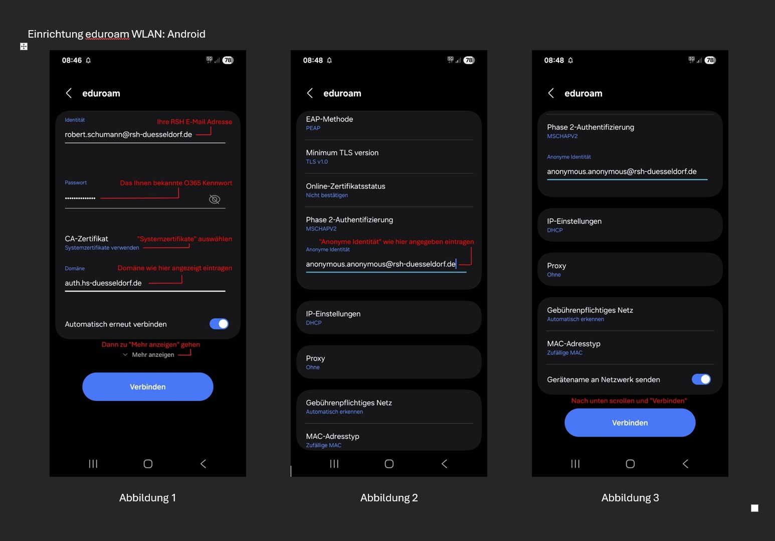Das WLAN-Netz in den Gebäuden _a und und _e der Hochschule heißt „eduroam“. Für die Nutzung des WLAN Netzes verwenden Sie bitte den Ihnen zugewiesenen Benutzernamen und das zugehörige Passwort. Für die Einrichtung des "eduroam" WLAN Zugriffs an Ihren mobilen Geräten verfahren Sie bitte nach der folgenden Anleitung.