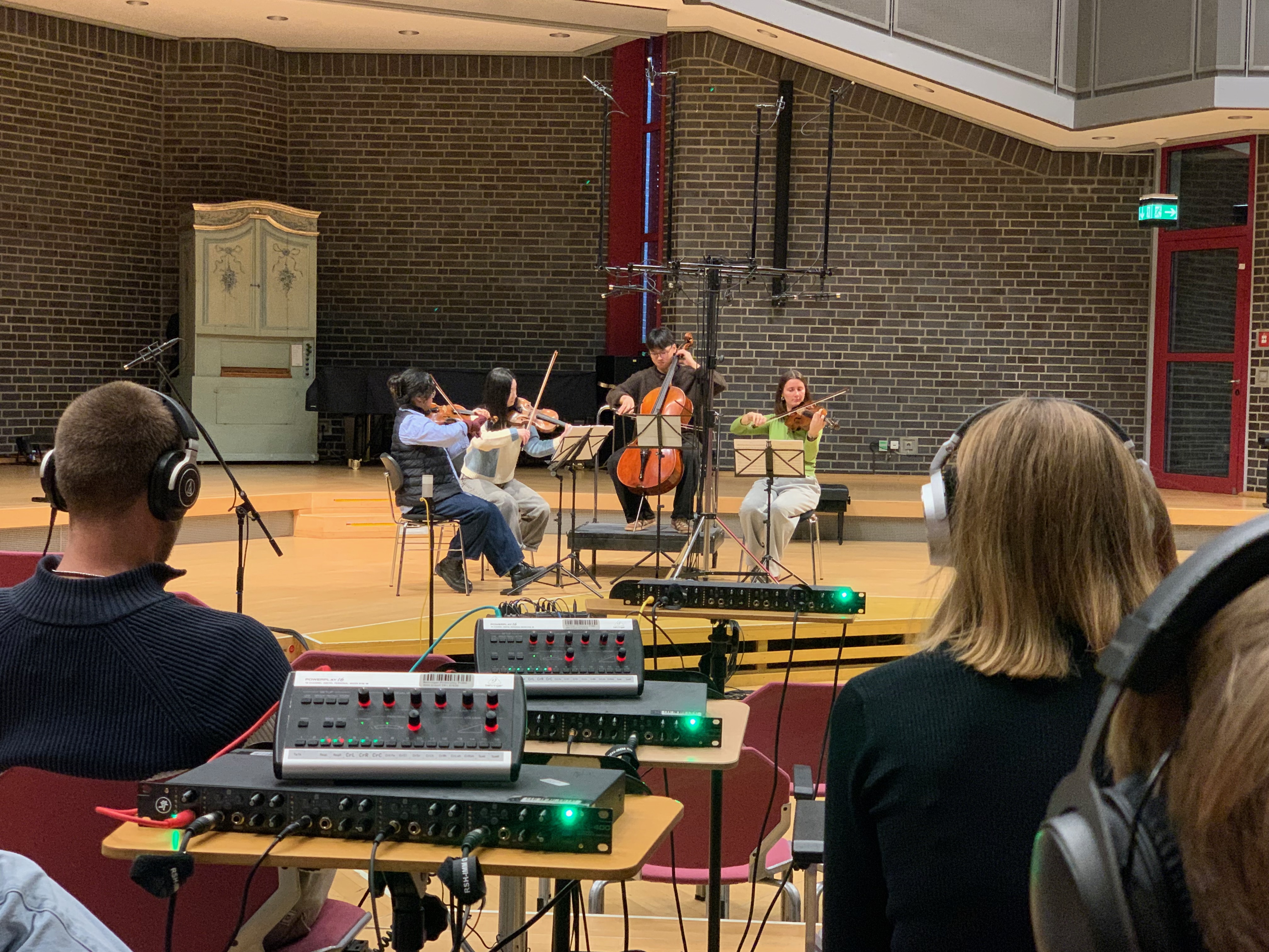 Am zweiten Tag der Masterclass führten die Studierenden unter der Leitung von Morten Lindberg zwei 7.1.4 - Aufnahmen im Partikasaal durch. Hier wurde detailliert an der Positionierung der Mikrofone des von ihm entwickelten Mikrofonsystems gearbeitet.