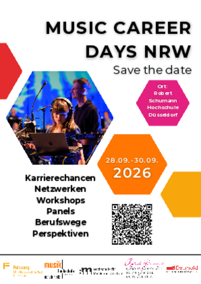 Vom 28.09.-30.09.2026 finden in der Robert Schumann Hochschule Düsseldorf erstmals die Music Career Days NRW statt. Gemeinsam mit den vier Musikhochschulen in NRW, der Folkwang Univeristät der Künste Essen, Musikhochschule Münster, Hochschule für Musik Detmold und Hochschule für Musik und Tanz Köln, veranstalten wir für die Studierenden drei Tage voller Workshops, Impulsvorträge, Panels, Netzwerkmöglichkeit und Konzerte rund um die Themen Berufswege, Karriereaufbau, Konzertformate und mentales Gesundheit.